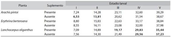 Las orugas alimentadas con Arachis pinto sin suplemento vitamínico fueron las que demoraron menos días en completar el I estadio larval (ANDEVA: p = <0,0001; gl = 2; = 6,53 días; D.E. = 1,44), el mismo comportamiento se dio en el II estadio larval (ANDEVA: p = <0,0001; gl = 2; = 13,81 días; D.E. = 2,54).