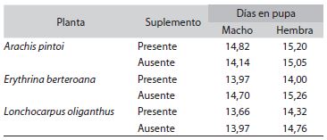Los machos alimentados con Lonchocarpus oliganthus, tardaron menos días en eclosionar de la pupa (ANDEVA: p = 0,0073; gl = 2;