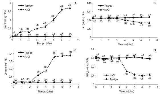 La concentración de nitrato mostró una pronunciada disminución a partir del cuarto día de tratamiento salino, y al finalizar el ensayo fue tres veces menor que en las plantas del testigo (Fig. 1D).