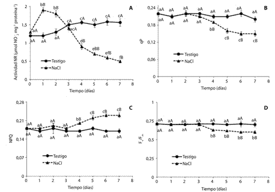 Una vez que el nitrato es absorbido debe ser reducido, antes de ser asimilado. Este paso clave en la asimilación del nitrógeno, es catalizado por la nitrato reductasa, produciendo nitrito, que posteriormente es reducido a amonio (Yousfi et al., 2012). La respuesta de la actividad NR de plántulas crecidas en presencia de NaCl, se caracterizó por un rápido incremento inicial, seguido por una importante inhibición a partir del cuarto día de tratamiento (Fig. 2A).