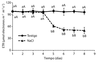 El estrés salino inhibió la etapa fotoquímica de la fotosíntesis en plántulas de algarrobo blanco, disminuyendo los valores de qP y aumentando NPQ (Fig. 2B, C). También se observó una marcada disminución en la tasa de transporte de electrones, a partir del quinto día de tratamiento salino (Fig. 3).