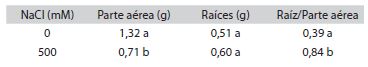 El estrés salino inhibió el crecimiento de la parte aérea; al cabo de 7 días de tratamiento las plántulas incubadas en 500mM de NaCl presentaron una biomasa aérea 46% menor que el testigo (Cuadro 1). El crecimiento de las raíces no fue afectado por la salinidad, por lo que la relación raíz parte aérea se incrementó.