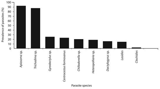 Parasites prevalence between species: The prevalence by species are shown in Fig. 1. Apiosoma sp. and Trichodina sp. showed the highest prevalence (92% and 87% respectively). While, lowest prevalence were registered by lasidies (14%) and glochidies (2%).