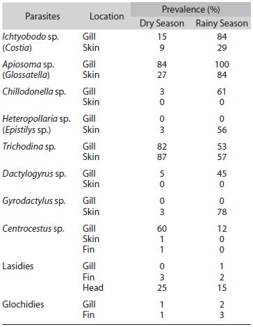 In dry season Chillodonella sp. showed a prevalence level of 3% but higher in rainy season (61%). However, this parasite was not registered on skin any season at all.