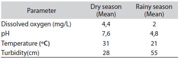 Physicochemical parameters of water:Table 2 shows the physicochemical parameters of water. The water temperature (ºC) was higher in dry season; likewise, the dissolved oxygen concentration, with a value of 4,4 mg/L, whereas, in rainy season was registered a value of 2mg/L. Turbidity had a value of 28cm, being highest in the rainy season.