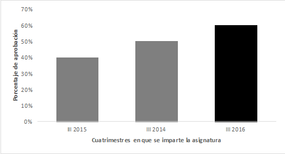 El porcentaje de aprobación en los cuatrimestres en los que no se aplicó la nueva metodología de trabajo fue menor al porcentaje obtenido durante el cuatrimestre en el que sí se utilizó. Es decir, hubo mayor respuesta de parte de los estudiantes que en los cuatrimestres anteriores. Pero no se obtuvieron diferencias significativas entre años 2014y 2016 (p= 0,03) y 2015 y 2016 (p= 0,219) (Figura 1).