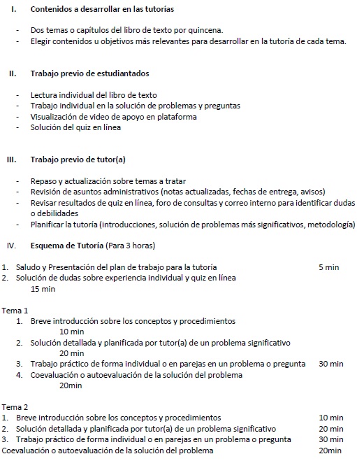 La propuesta se puede observar en el apéndice digital 1. Entre los contenidos más importantes desarrollados en esta propuesta se encuentran la experiencia previa de la materia, tanto por parte del estudiantado como del personal docente y la realización de un quiz antes de la tutoría, que permita y obligue el repaso de los temas que se verán en clase.