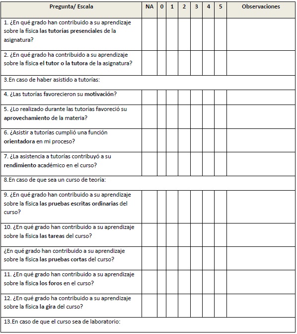 Con respecto a las respuestas obtenidas en la encuesta aplicada al estudiantado para determinar su percepción sobre la nueva estrategia utilizada en las tutorías, se encontró que la percepción general del estudiantado con respecto a este nuevo modelo es positiva en cuanto a motivación, aprovechamiento, giras, pruebas cortas, laboratorios; sin embargo, en algunos casos se encontró que no fue tan positiva en mejorar su rendimiento ni su aprendizaje en las pruebas escritas.
