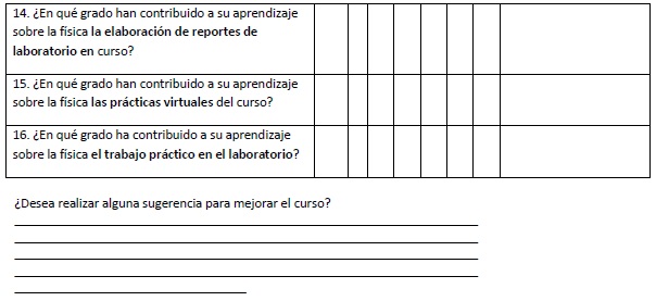 Elaboración de encuestas para personal docente y estudiantado: Para determinar la percepción que tanto el personal docente como el estudiantado tuvieron de la implementación de esta nueva experiencia, se procedió a elaborar dos instrumentos de medición. Los instrumentos utilizados se pueden observar en los apéndices digitales 2 y 3.