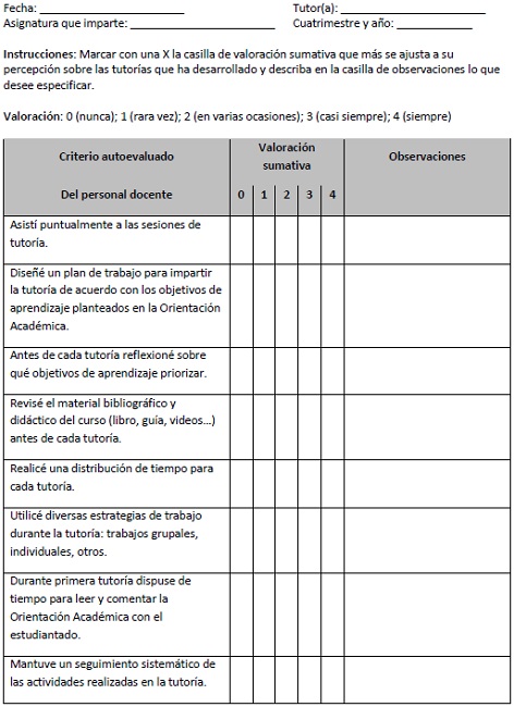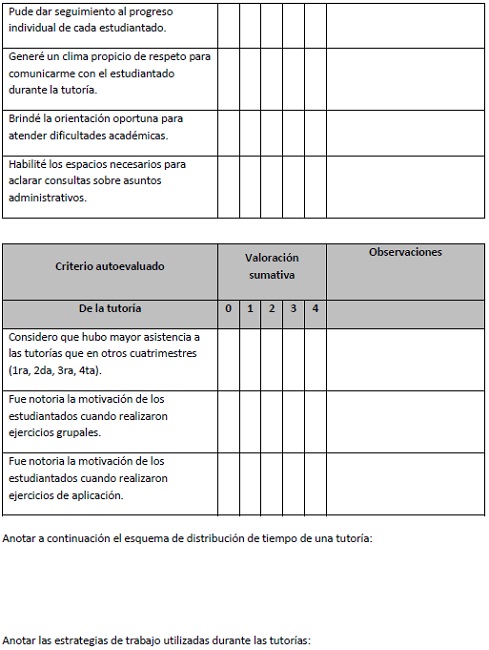 Sobre las oportunidades que dan las tutorías, destaca la de generar estrategias de evaluación de los aprendizajes de carácter diagnóstico y formativo. En este sentido el tutor puede determinar en la tutoría, a partir de técnicas como la observación y la entrevista aspectos socio-afectivos-geográficos, entre otros del estudiantado, pero, también identificar el grado de conocimiento que posee acerca de los contenidos de la asignatura mediante la aplicación de diversos instrumentos y actividades como cuestionarios, debates, preguntas generadoras, entre otros.