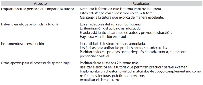 En el Cuadro 1 se muestran los comentarios que el estudiantado dio sobre su percepción acerca de la nueva experiencia. Se puede constatar en el Cuadro 1, que el trabajo docente, así como la evaluación son calificados positivamente, no así el entorno de la tutoría. La infraestructura parece tener serias deficiencias en cuanto a ruido, iluminación y ventilación. Las sugerencias van en el ámbito de la metodología de las tutorías, el entorno virtual y el libro de texto.