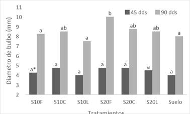 El crecimiento del diámetro del bulbo en las plántulas de palma aceitera, se encontró un incremento significativo al agregar compost de fibra en mezcla al suelo en las bolsas (Figura 2). El diámetro de bulbo en los primeros 45 dds no mostró diferencias significativas en comparación al resto de los tratamientos, sin embargo, al analizar este parámetro de crecimiento a los 90 dds se encontró que el tratamiento S20F mostró el mayor diámetro de bulbo (10mm) en comparación a las plantas sembradas en Suelo (8mm) significativamente (α=0,05).
