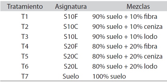 Se procedió a realizar seis mezclas crecientes partiendo de dos bases de suelo (80% y 90%) y completando el resto del volumen con los tres residuos industriales (20% y 10%). Para realizar las mezclas con una base de 80% de suelo, se efectuó mediante una mezcla volumétrica usando un balde de 20L, aplicando ocho baldes de suelo más dos del material industrial (fibra, lodo o ceniza). Para la mezcla base de 90% de suelo se procedió a aplicar nueve baldes más uno de los materiales industriales para cada mezcla. Se mezcló homogéneamente y se procedió a colocarlos en bolsas plásticas de 25 x 20cm, además para comparar el efecto de los materiales en el previvero se dejó un testigo absoluto con 100% suelo (Cuadro 2).