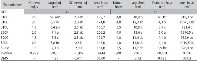 El área foliar determinada no mostró diferencias estadísticamente significativas a los 45 dds entre los tratamientos. No obstante, al comparar los tratamientos a los 90 dds se encontró que el tratamiento S20F reveló la mayor área foliar (1396,5 cm2) que estadísticamente difiere de varios tratamientos.
