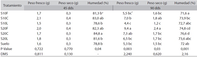 La biomasa en las plantas referente a los 45 dds y 90 dds, mostró que la adicción de material residual (fibra, lodo y ceniza) permitió un aumento en la materia seca (Cuadro 4). Al realizar la comparación entre el peso fresco a los 45 dds, no hubo diferencias estadísticas significativas (α=0,05) entre los tratamientos. Sin embargo, al analizar esta variable a los 90 dds, el tratamiento S20F obtuvo el mayor peso fresco (9,4g) en comparación al resto de los tratamientos. El comportamiento del peso seco fue proporcional al peso fresco, donde a los 45 dds no existieron diferencias estadísticas entre los tratamientos, sin embargo, a los 90 dds el tratamiento S20F mostró la mayor acumulación de biomasa seca (2,4g) en comparación al resto de los tratamientos. La obtención del porcentaje de humedad para los tratamientos S10F, Suelo, S10L y S20L reveló diferencias estadísticas (α=0,05) con respecto los demás tratamientos, siendo menor para el tratamiento S10F (71,6 %).