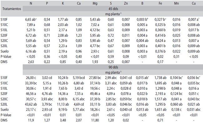 La absorción de Fe, fue significativa a partir de los 45 dds, donde el tratamiento S20C se destaca con relación a los demás tratamientos, así mismo a los 90 dds, se encontró la mayor acumulación de este micronutrimento en el tratamiento S20F (2,193 mg planta-1). El Cu con el tratamiento S10L se obtuvo la mayor acumulación a los 45 dds, mientras que a los 90 dds, el tratamiento S20F (0,051 mg planta-1) reveló la mayor acumulación. El Mn no presentó diferencias estadísticas a los 45 dds, pero a los 90 dds, el tratamiento S20F mostró la mayor absorción (0,022 mg planta-1) en comparación a los otros tratamientos.