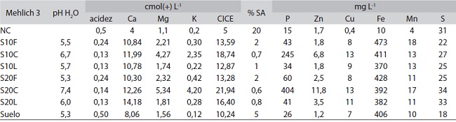 *Solución extractora Mehlich 3, Laboratorio Suelos y Foliares, Centro de Investigaciones Agronómicas, Universidad de Costa Rica.; NC = nivel crítico para Inceptisoles según Cabalceta & Molina (2006). CICE = Capacidad de intercambio de Cationes Efectiva (Acidez + Ca + Mg + K.). S.A. = Saturación de Acidez (100 * Acidez / CICE)