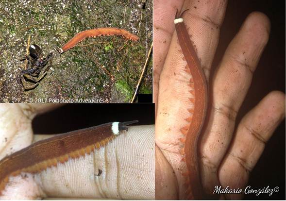Abstract: Onychophoran worms seldom attack spiders because spiders are agile and dangerous prey. Here we report an onychophoran feeding on a spider (possibly a Ctenidae) in Sierra Llorona, Colón, Panamá (9, 35863°-79,70287°; altitude 491 m).