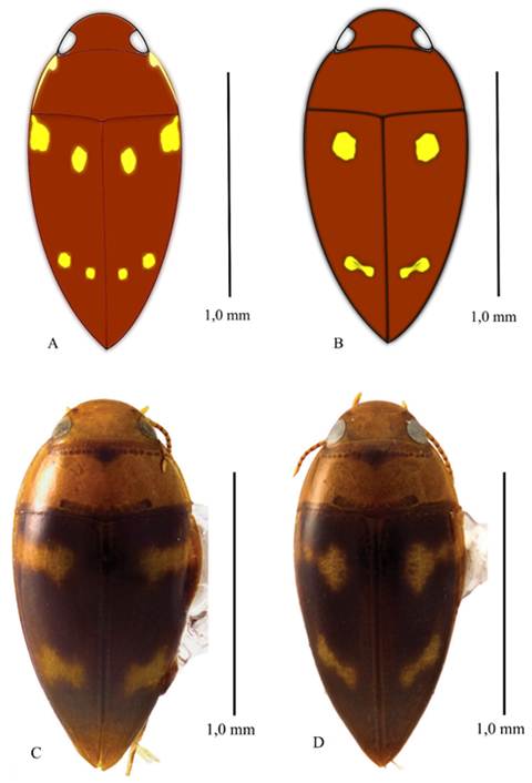 Diagnosis. Tres pares de mancha dorsales: un primer par de manchas alargadas amarillentas, sobre los márgenes laterales del pronoto, ancha en el extremo anterior y aguzándose hacia la parte posterior; un par de manchas amarillentas de diámetro mayor sobre la región humeral del primer tercio elitral en cada élitro y un par de manchas amarillentas de menor diámetros sobre el disco central del primer tercio elitral y dos pares sobre el tercio apical de diámetros similar a las manchas del primer tercio elitral (Figura 1A).