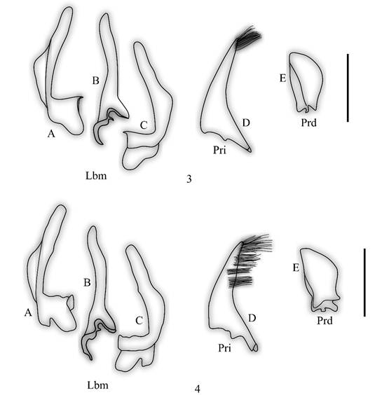 Identificación taxonómica y extracción de órganos genitales: El reconocimiento de las especies se realizó utilizando un estereomicroscopio marca Leica Wild M10 de alta resolución, ocular 80x y objetivos 25x. Algunos ejemplares estuvieron sometidos a un tratamiento con agua caliente durante dos minutos, para producir el ablandamiento de los escleritos genitales. Seguidamente fueron extraídos en solución de glicerina absoluta, luego sumergidos en KOH al 10%, durante varios min para aclararlos y eliminar restos de tejido conectivo adheridos a la quitina. Las genitalias de los machos se dibujaron con una cámara lúcida y diseñada con Corel Draw Graphi Suite X8 versión 1.0.298.1. Las estructuras genitales se preservaron en micro viales, con solución alcohólica de glicerina, para posteriores usos.