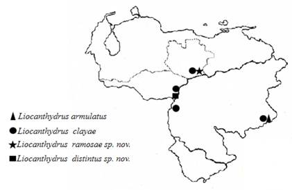 Las claves sistemáticas que se construyen para introducir las dos nuevas especies de Liocanthydrus son una adaptación de Baca et al. (2014) y Guimarães y Ferreira-Jr. (2015). Se presenta un mapa con las localidades de las especies de Liocanthydrus en Venezuela (Figura 3).