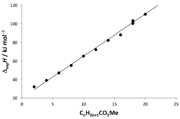 The ΔvapH values are similar within experimental uncertainty (average 102 ± 5 kJ/mol), and as expected, are found of the same magnitude of those of pure fatty esters of similar chain length (e. g. methyl palmitate 88 kJ/mol, methyl stearate 100 kJ/mol, methyl oleate 103 kJ/mol, methyl linoleate 102 kJ/mol, methyl linolenate 102 kJ/mol). These values were obtained from the data collection of Chickos and Acree, Jr (2003). Again, the acyl chains are mainly responsible for the degree of cohesion of these systems, as is observed in Figure 1 for linear chain carboxylic esters.
