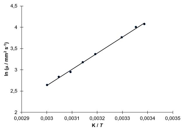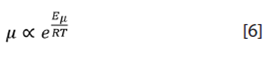 Equation [6] indicates that Eμ is the relative change of μ per unit temperature change, ∂ 𝜇 𝜇 𝜕𝑇 . These values are obtained as the slope of graphs of ln μ vs. 1/T, in an Arrhenius-like fashion.