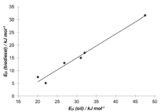 Eμ (biodiesel) / kJ mol-1 = [(0,94 ± 0,08) Eμ (oil) / kJ mol-1] - (13 ± 2) p < 0,0002 [7]