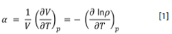 Knowledge of the cubic expansion coefficient and isothermal compressibility of fluids is needed for the design of hydraulic equipment. The observable thermodynamic properties of materials can be understood in terms of the forces between the constituent molecules. The molecular interpretation of α provides a way to assess the system cohesivity, because stronger attractive intermolecular forces allow only small inter-particle spacing gained by thermal energy increase (temperature). This thermodynamic coefficient is easily obtained from the temperature effect on density (ρ) as indicated by equation [1], in the temperature range from 18°C up to 33°C.