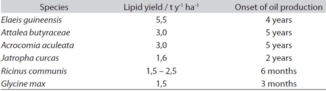 The plants are present around the world and can grow under adverse environmental conditions and need no optimal soils. Soybean (Glycine max) is included as comparison, because its oil is widely used to produce biodiesel. The periods of initiation of oil production suggest that good agronomical techniques must yet be developed, based on simultaneous multiple-species cultivation that could start yielding economical revenue from earlier times.