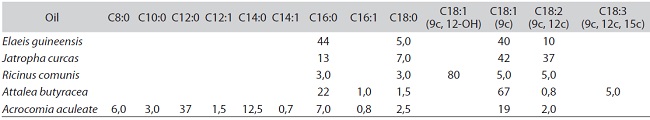 Physic nut (Jatropha curcas), castor-oil (Ricinus communis), oil palm (Elaeis guineensis), wine palm (Attalea butyracea) and macaw palm (Acrocomia aculeata) were chosen for study in our laboratory, because they are oleaginous plants with convenient oil yields to produce biodiesel. These species are considered in the agro-industrial initiatives indicated above.