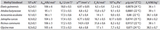 Key words: biodiesel, thermodynamic properties, kinematic viscosity, Acrocomia aculeate, Attalea butyracea, Elaeis guineensis, Glycine max, Jatropha curcas, Ricinus communis.