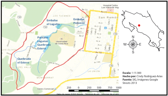 El embalse El Laguito se encuentra dentro de la Sede de Occidente de la Universidad de Costa Rica (10º05`47”-10º04`31”N y 84º28`20” y 84º29`41”O), en la provincia de Alajuela. Se ubica dentro de la microcuenca Estero, que a su vez está dentro de la subcuenca del río Grande de San Ramón y de la cuenca del río Grande de Tárcoles (Figura 1). El área aproximada es de 1,62km2. El patrón de lluvias es el característico del Valle Central; la época seca va de enero a abril y la lluviosa de mayo a noviembre; pertenece a la zona de vida de Bosque Premontano Húmedo (Rodríguez & Silva, 2015).