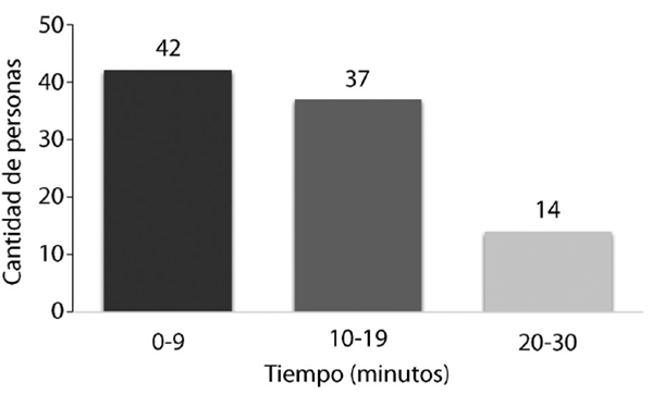 Prácticas en el uso de agua: Se determinó que existen inadecuadas prácticas en el uso del agua lo cual provoca que la cantidad que ingresa al El Laguito sea alta. El 56% (51) de las personas encuestadas exceden el tiempo recomendado de baño sugerido por la OMS, el cual es de 5 a 10 minutos (Figura 2).