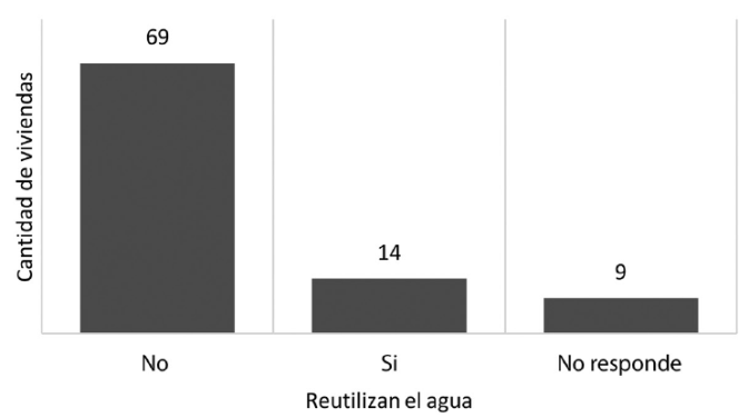 Técnicas para disminuir el consumo de agua potable: No existe en la población una costumbre de recoger el agua de la ducha, lavatorios o lavadoras para regar. Únicamente en el 15% (14) de las viviendas se recoge algún tipo de agua para su posterior reutilización (Figura 4).