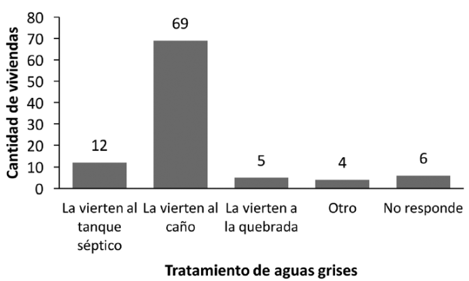 Fuentes de contaminación: Las principales fuentes de contaminación son el uso de detergentes no biodegradables y el vertido de aguas grises al caño o la quebrada. En el 96% (88) de las viviendas utilizan jabón en polvo no biodegradable para el lavado de la ropa. El 80% (74) de las viviendas vierten las aguas grises directamente al caño o a la quebrada (Figura 6).