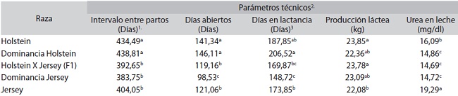 Parámetros reproductivos. En el Cuadro 1 se observa el desempeño reproductivo de las razas evaluadas y sus cruces en diferentes proporciones según los datos recolectados y el análisis planteado. Para los parámetros reproductivos, IEP y días abiertos, la raza Holstein superó a la raza Jersey, a los cruces HxJ F1 y a los cruces con dominancia Jersey en 30,44 y 20,28; 41,84 y 22,18; 50,74 y 42,81 días respectivamente para cada parámetro (p<0,05). No así, a los cruces HxJ con dominancia Holstein, donde no se determinaron diferencias significativas.