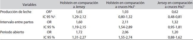 Asociaciones relativas entre razas para los indicadores de producción de leche diaria, intervalo entre parto y periodo abierto. Se describe en el Cuadro 2, para la variable producción de leche diaria, que la raza Holstein presenta una mayor probabilidad de generar una mayor producción de leche diaria que los animales Jersey y que los cruces en diferentes proporciones. Si es importante considerar el intervalo de confianza, obtenido en la comparación de la raza pura y los cruces, debido a que el rango al estar por debajo de cero, indica que ambos grupos podrían presentar niveles altos de producción. En relación a las variables reproductivas (Cuadro 2), los valores del coeficiente de chance sugieren que los animales Holstein, son propensos a presentar mayor cantidad de días entre cada parto y para iniciar una nueva gestación. De igual manera, como se presentó en la variable producción de leche diaria, la probabilidad de presentar menor cantidad de días para el IEP y el PA, es la misma al comparar el animal Jersey y los cruces, debido al valor obtenido del intervalo de confianza.
