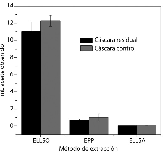 El porcentaje de rendimiento del método de destilación con equipo Soxhlet utilizando como solvente hexano coincide con lo reportado por Cardona, Ríos y Restrepo (2006), y las deficiencias en el método de extracción por prensado se deben a que, al comprimir la cáscara, una cantidad del aceite queda adherido a la plantilla plástica utilizada al igual que en el frasco contenedor, previo a la centrifugación. El bajo rendimiento en la extracción líquido-líquido con solvente acuoso se le atribuye al proceso de fermentación que se lleva a cabo en la maceración y a las pérdidas causadas por el restante adherido a las paredes del embudo de separación. Se encontró que la cáscara control presenta mayor rendimiento que la cáscara residuo, sin embargo, no se obtuvo variación en la obtención del aceite de la cáscara residual.