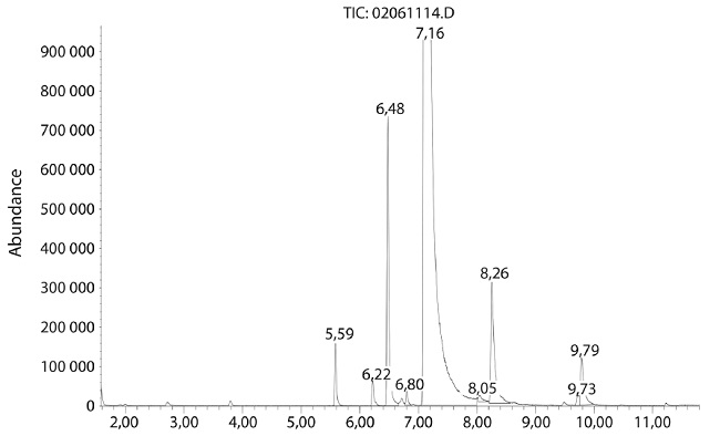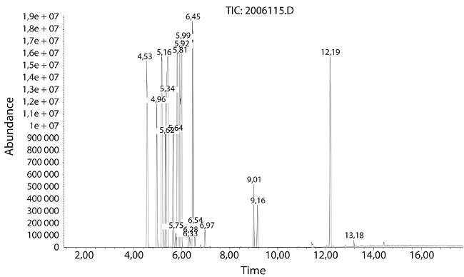 Posteriormente se determinaron los componentes del aceite por cromatografía de gases, con el objetivo de conocer los compuestos que le confieren sus propiedades inhibitorias de microorganismos. Se utilizó un cromatógrafo de gases series GC Agilent Technologies HP 7890 acoplado a un detector selectivo de masas 5973 Network Agilent, con columna capilar 30m x 25µm x 0,25mm marca HP, con inyector split/splitless. El modo de inyección de la muestra para determinar compuestos orgánicos volátiles y semivolátiles fue por espacio de cabeza (Head-space) y la identificación de componentes no volátiles se realizó por inyección directa. Estabilizado el equipo, se cargó el programa de aceite con las condiciones de Inyector: temperatura: 200°C; presión: 17psi; flujo: 42,3 mL/min; relación 40:1. Columna: DB-5MS, 0,25mm×30m×0,25µm; temperatura máxima: 350°C; presión a vacío: 17psi. Horno: temperatura inicial: 50°C por minuto; temperatura final: 250°C por 25 minutos. Detector: temperatura: 250 °C.