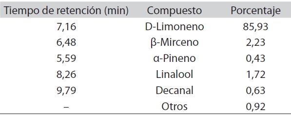 El análisis cromatográfico mostró el siguiente cromatograma (Fig. 2), en el cual los picos que destacan son los correspondientes al D-limoneno, β-mirceno, linalool, decanal, α-pineno y sabineno, concentraciones similares a lo reportado por Chaimala y Phutdhawong (2007), Juárez et al. (2010), en el Cuadro 1 se muestran los tiempos de retención y el porcentaje de cada compuesto presente en el aceite.