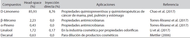 En el Cuadro 2 se presentan los compuestos detectados por CG-EM inyección directa y por Head-space, describiendo las aplicaciones reportadas en dichos compuestos.