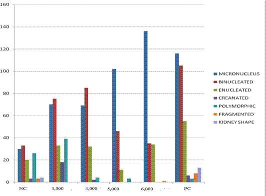 Frequency of MN and other nuclear abnormalities observed in mice treated with AgNPs are shown in Figure 1, 2 and 3. MN frequency reached its peak at 6,000mg/Kg of AgNps indicating that the induction of MN was concentration-dependent.
