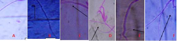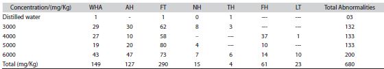 Results of frequency of sperm cell morphology abnormalities in mice treated with AgNPs are shown in Table 2. These results revealed that frequency of abnormalities reached its peak at 6,000mg/Kg of AgNps, the total sperm head abnormalities was 200 compared with negative control (distilled water) which was 3.