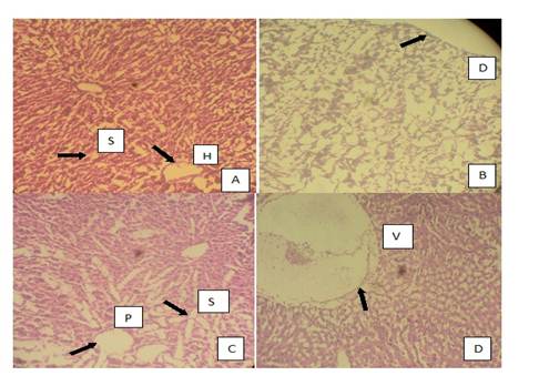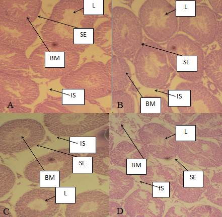 Histological examination: The preparation of tissue sections for histological examination under light microscope followed the standard embedding and H-E staining protocol. Testes and liver were removed from the animals used for test and control. Slices of these organs were fixed in 10% neutral buffered formalin. Fixation was carried out after 48 hours after which organs were dehydrated by passing through ascending order of ethyl alcohol-water concentrations, cleared in xylene and sequentially embedded in paraffin wax blocks using rotary microtome. Tissue sections of 3-5μm thick were cut, stained with Haematoxylin-eosin (H-E), then mounted in neutral DPX medium for morphological evaluation before microscopic examination at magnification 400 x.