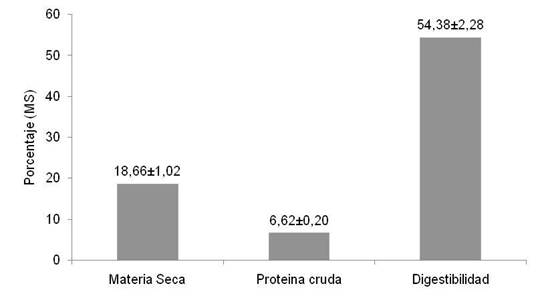 Análisis de laboratorio: Mediante la metodología de la AOAC (2000) se determinó el porcentaje de materia seca (MS) en estufa a 60°C durante 48h, el contenido de proteína cruda (PC) por el método de Kjedalh y la digestibilidad in vitro de la materia seca (DIVMS) a los materiales ensilados y henificados, siguiendo la metodología de Van Soest y Robertson (1985). En el caso de los materiales ensilados, el pH se determinó utilizando un medidor de pH con electrodo de hidrógeno y el nitrógeno amoniacal fue analizado utilizando la metodología descrita por Tobía (2004).