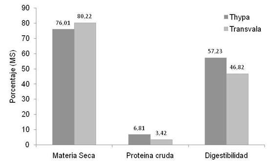 Heno. El heno de tifa, presenta un contenido de materia seca menor, pero 1,99 veces más proteína cruda y 1,22 veces más digestibilidad que el heno de transvala (Fig. 2). Lo cual permite considerar este material como sustituto del heno de transvala en el cuido de animales rumiantes en estas zonas. El proceso de deshidratación empleado, permitió incrementar el contenido de materia seca del material en 57,35 unidades porcentuales. Incremento que permite almacenar este material a corto plazo en lugares secos, sin el inconveniente que se genere un deterioro del mismo.