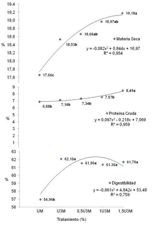 Digestibilidad in vitro de la Materia Seca: La digestibilidad de los materiales se mejora en 4,72 unidades porcentuales al adicionar la melaza y la urea en comparación con el material sin aditivos (Fig. 3) (p<0,05). Se encontró un efecto positivo en el aprovechamiento del ensilado al aplicar la melaza, sin embargo, al adicionar la melaza con la urea, se da una merma en el aprovechamiento, que se mejora según el incremento de la urea adicionada.