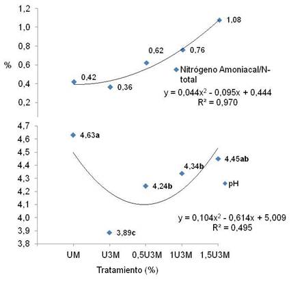Nitrógeno amoniacal y pH de los ensilados: Se nota en la figura 4, una tendencia a incrementar en el contenido de nitrógeno amoniacal, debida a la adición de urea (p>0,05). En el caso del pH de los ensilados, la adición de melaza (p<0,05), permite disminuir el pH del material por debajo de 4, efecto que se reduce conforme se adicionan los niveles crecientes de urea.