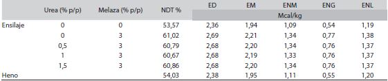 Estimación de la energía del ensilaje: Por medio de la ecuación que relaciona la digestibilidad de la tifa con su contenido de nutrimentos digestibles totales (NDT) en plantas con 4 y 12 meses de rebrote descrita por WingChing-Jones y Leal-Rivera (2014), se procedió a estimar el valor de NDT de las mezclas ensiladas y del material henificado, según la siguiente ecuación: Y= -0,2239 X2 + 28 X - 0,5542 (R2 = 0,5542), donde Y = nutrientes digestibles totales y X = porcentaje de digestibilidad in vitro de la materia seca. Posterior al cálculo de los nutrientes digestibles totales (NRC, 2001), se procedió a estimar los contenidos de energía digestible (ED), metabolizable (EM), neta de lactancia (ENl), neta de mantenimiento (ENm) y neta de ganancia (ENg) de los materiales (Weis, 2004).